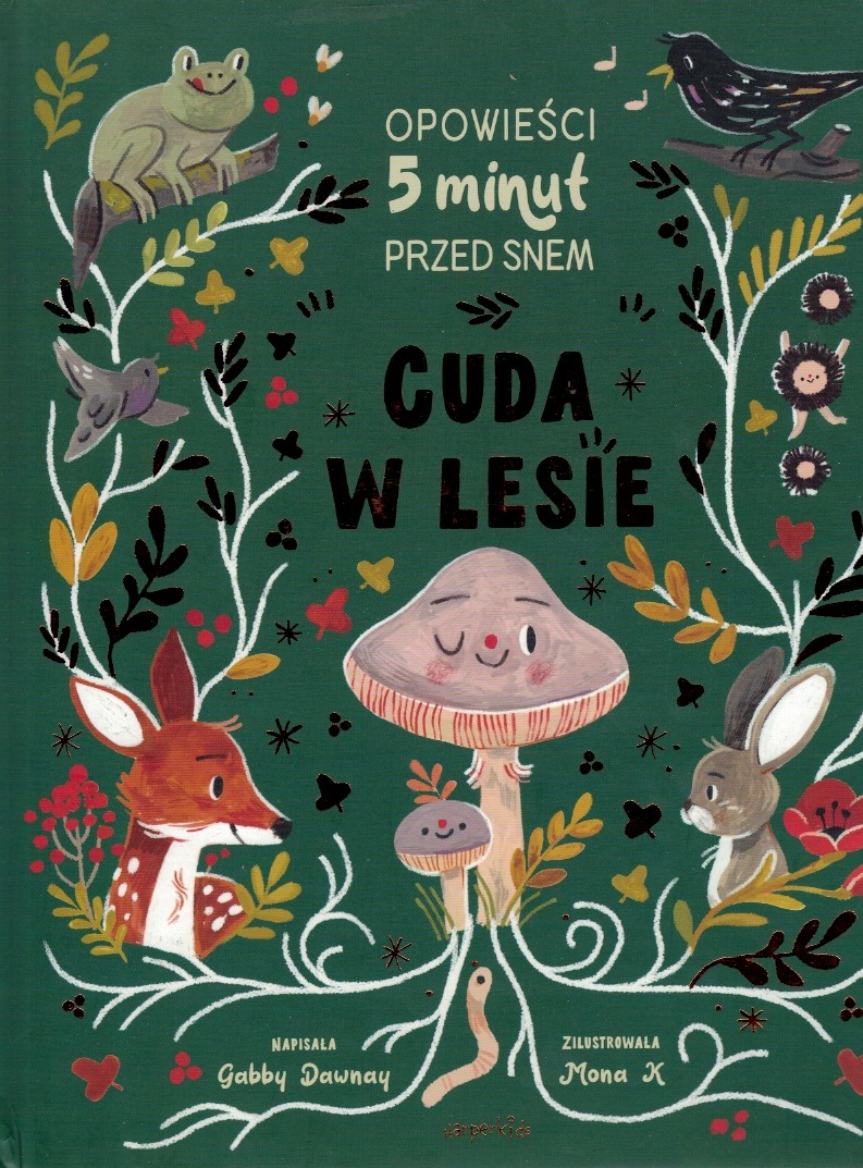 Na skraju tej łąki, co w tańcu wciąż gnie się, jest świat pełen cudów. Gdzie cuda są? W lesie! Dzieci w sposób naturalny zachwycają się przyrodą. Ochoczo obserwują motyle, mrówki i ślimaki; brodzą w kałużach i grzebią w piasku; zbierają liście, muszle, kasztany czy kwiaty. I zadają przy tym mnóstwo pytań. Warto tę ciekawość zaspokajać, a jeszcze lepiej podsycać, bo chłoną wiedzę jak gąbka. A że natura potrafi być tajemnicza, dziecięca wyobraźnia uruchamia się z łatwością... Ten czarowny świat udało się zamknąć w równie niezwykłej książce - „Cuda w lesie”. To barwna opowieść o dużych i małych mieszkańcach lasu, o niezwykłych zjawiskach, które zachodzą w naturze każdego dnia i o tym, że wszystkie elementy w przyrodzie są ze sobą powiązane. Z dziewięciu opowieści młodzi czytelnicy dowiedzą się m.in., jak rosną grzyby i czy drzewa ze sobą rozmawiają; zrozumieją, jak pożyteczne są żuki i pszczoły; jak kijanka zamienia się w żabę; co ćma widzi w nocy i czym różni się życie ptaków i ssaków w stadzie. Niezwykłości przyrody zostały przedstawione w równie oryginalny sposób - za pomocą… wierszowanych opowieści.